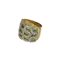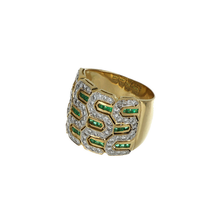 Anello a fascia in oro giallo e bianco con smeraldi e diamanti a motivo geometrico ricorsivo.