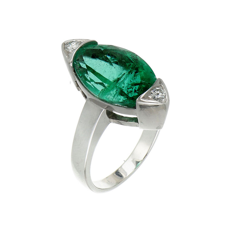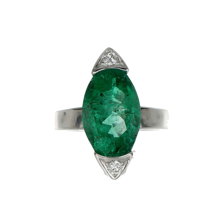 Anello in oro bianco con al centro grande smeraldo taglio navette e due diamanti taglio brillante sul gambo.
