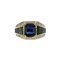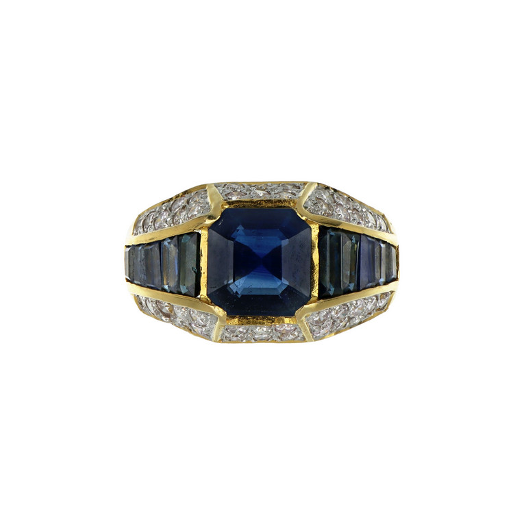 Anello a fascia geometrica realizzato in oro bianco e giallo con zaffiro centrale taglio smeraldo quadrato (carati 2 00 ca.) e taglio baguette scalari sul gambo.