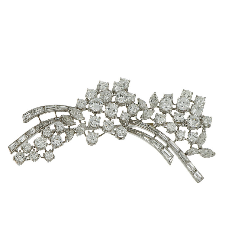 Spilla in platino a tralcio realizzata con diamanti taglio brillante e navette nella parte centrale baguette sui gambi per complessivi carati 6 00 ca