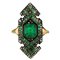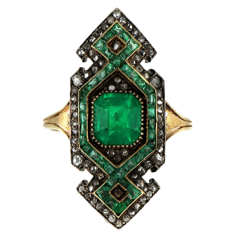 Anello di forma geometrica con smeraldo centrale di carati 1 00 ca. in oro giallo con fine decoro realizzato con piccoli diamanti taglio antico e altrettanti smeraldini a intrecciarsi con incassatura binario e minuzioso aggiorno.