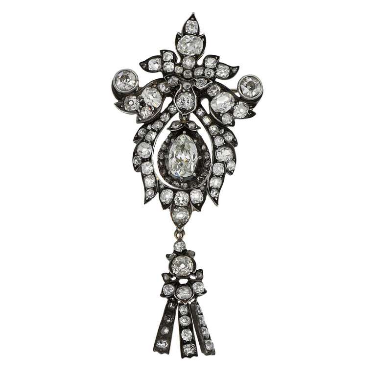 Pendente in argento e oro con diamanti taglio antico di diverse forme uno a goccia di carati 1 30 ca utilizzabile anche come spilla finemente aggiornato e snodato con piccolo fiocco nella parte inferiore.
