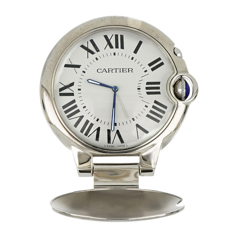 CARTIER sveglietta da viaggio modello 'baloon bleu' in metallo rodiato movimento al quarzo astuccio originale.