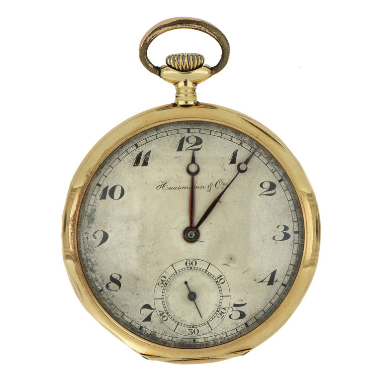 HAUSMANN E CO. orologio da tasca in oro giallo doppia cassa con quadrante argente' lancette breguette numeri arabi e piccoli secondi al 6.
