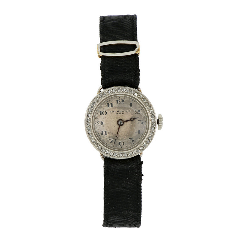HAAS NEVEUX orologio da signora in oro e diamanti taglio rosa sulla lunetta animato da movimento a carica manuale cinturino in tessuto nero necessita di riparazione.