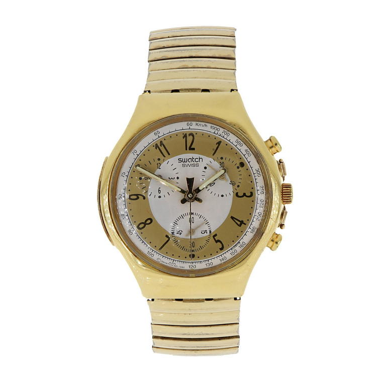SWATCH raro modello di orologio con movimento cronografico e rivestimento cassa in oro giallo amovibile cinturino in metallo dorato elastico.
