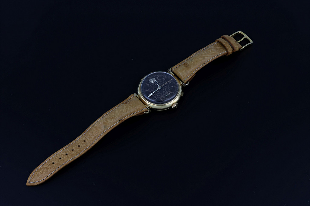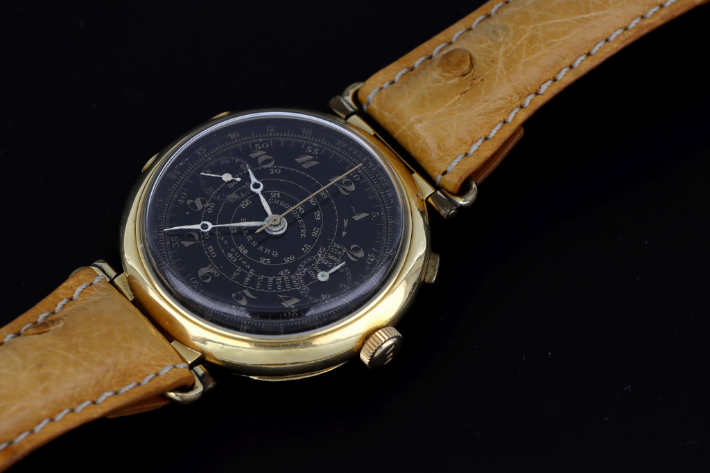 EBERHARD orologio da uomo in oro giallo diametro 40 mm con funzione cronometrica monopulsante monta un raro quadrante nero con grafiche bianche scale tachimetrica a spirale e telemetrica alla periferia.