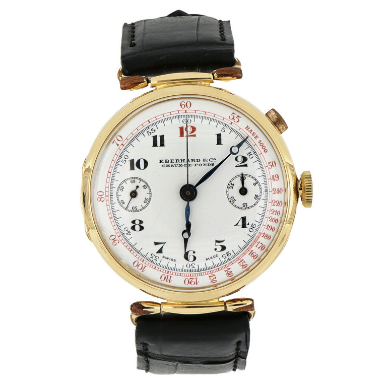 EBERHARD orologio in oro giallo con funzione di cronografo monopulsante diametro cassa 40mm anse snodate quadrante in smalto bianco integro.