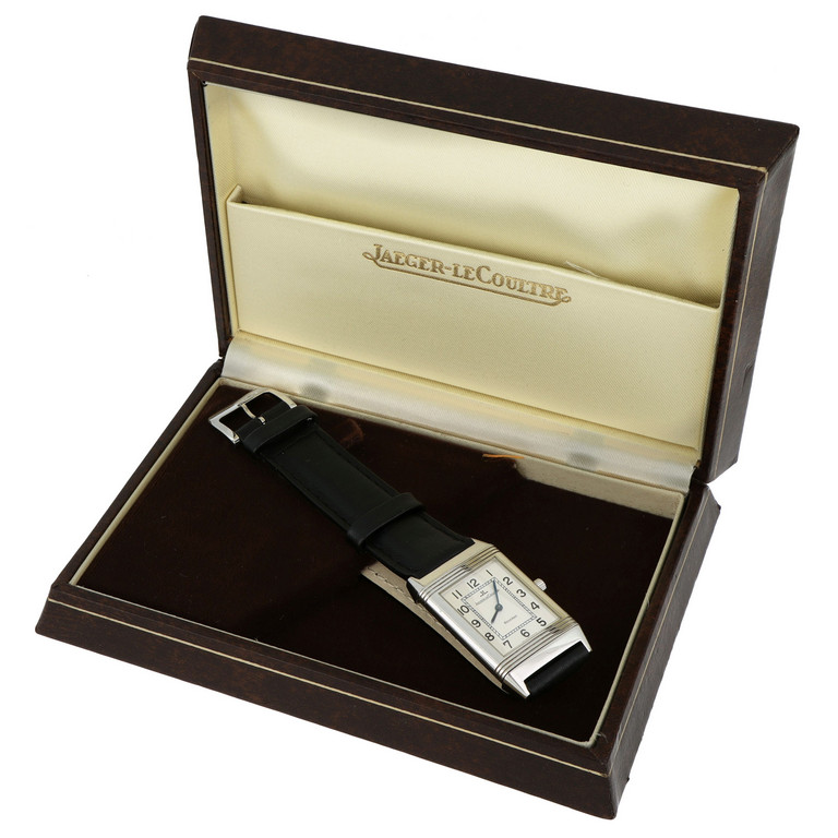 JAEGER LE COULTRE orologio da uomo modello reverso in acciaio con fibbia originale e bracciale in pelle animato da movimento meccanico a carica manuale rettangolare con cassa basculante e quadrante con minuteria chiusa sfere a daga azzurrate in ottime condizioni di conservazione.
