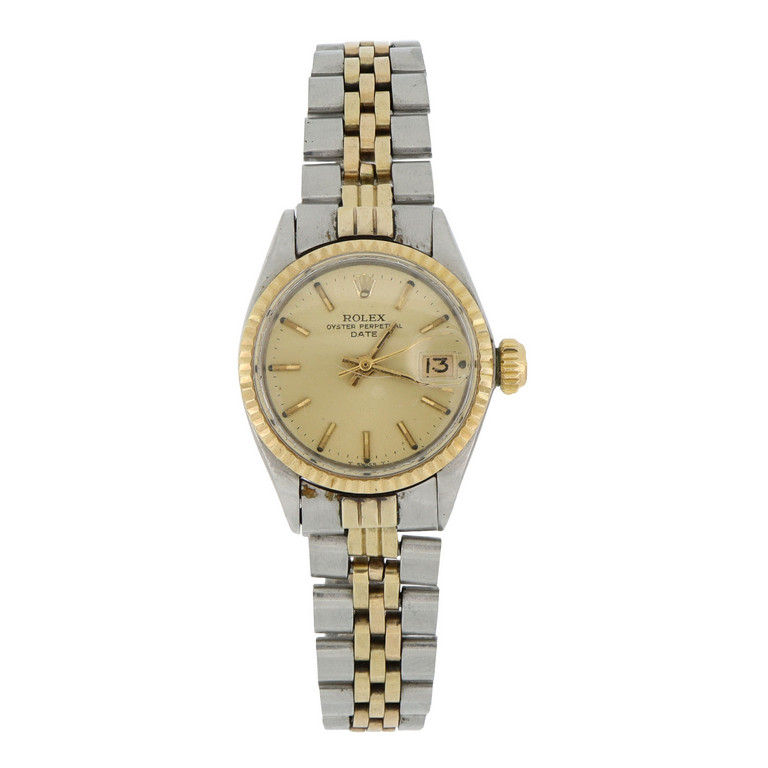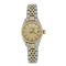 ROLEX orologio da donna in acciaio e oro giallo modello Date diametro 24 mm cinturino jubile' movimento a carica automatica quadrante champagne indici a bastone datario a ore 3 vetro plastica.