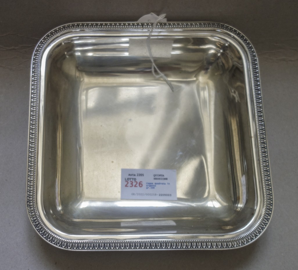 Previous Lot 2326 Next Aste Boetto - Via Mura dello Zerbino 10R, 16122 Genova Asta di Gioielli, Orologi e Argenti Moderni Asta di Gioielli, Orologi e Argenti Moderni Thursday 23 June 2022 hours 15:00 (UTC +01:00) OGGETTISTICA Coppa quadrata in argentogr.330
