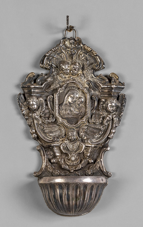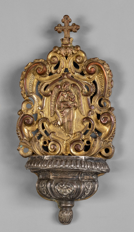 Acquasantiera in rame dorato con vaschetta in argento sec.XVIII (h.cm.23) e acquasantiera in argento con Madonnina ed angeli (h.cm.16)