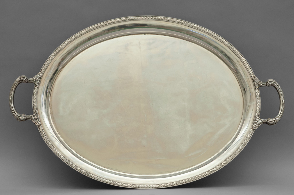 Vassoio ovale in argento con manici bordo decorato con palmette
