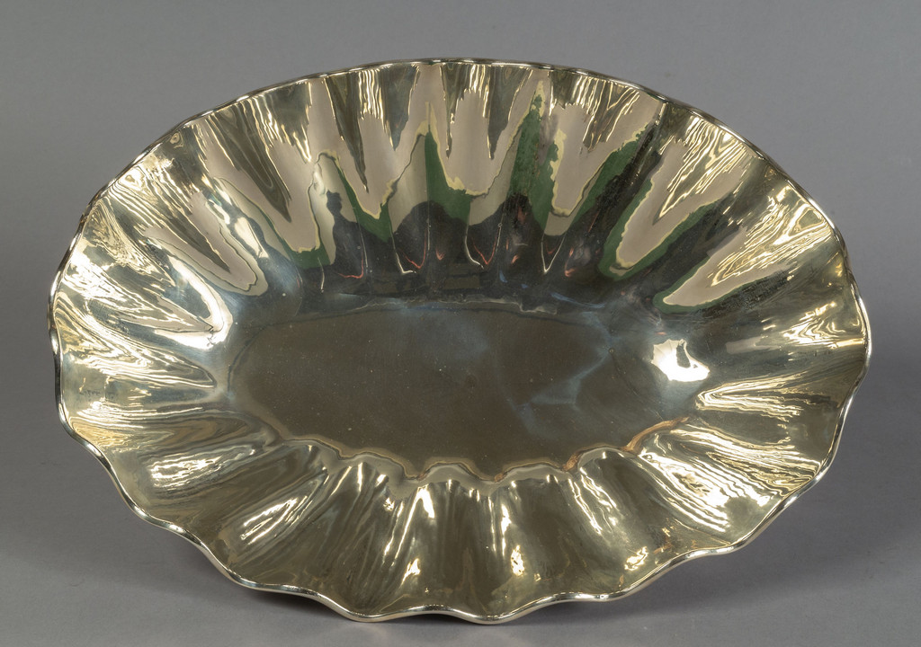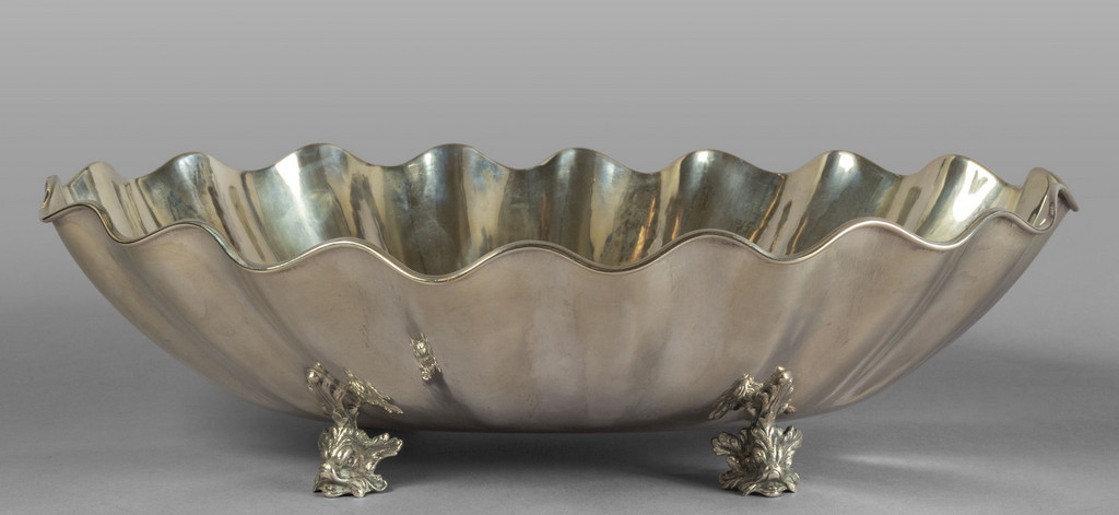 Grande alzata centrotavola in argento sbalzato piedini a forma di delfini