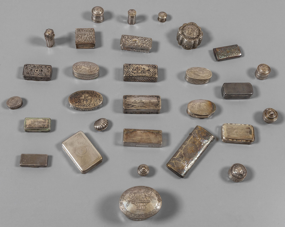 Ventinove scatoletta in argento di varie forme epoche e misure di cui alcune niellate