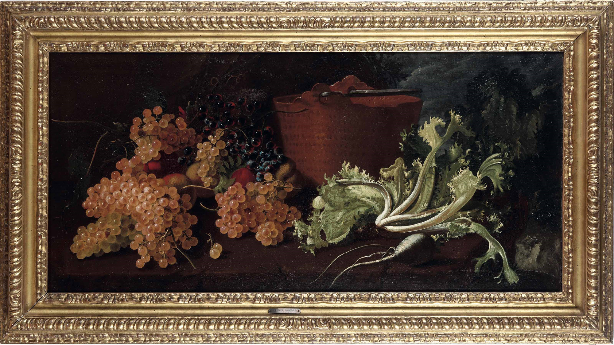 Scuola napoletana del XVII secolo Natura morta con frutta, verdure e una pentola in rame
