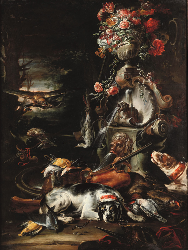 Cusati Gaetano, Natura morta con cacciagione su sfondo di giardino