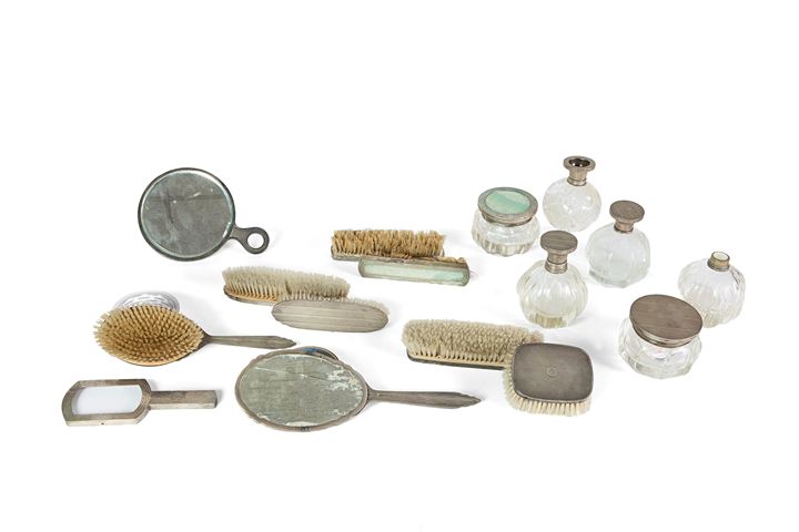: sei portaprofumi in cristallo ed argento di varie forme; tre specchi; sette spazzole