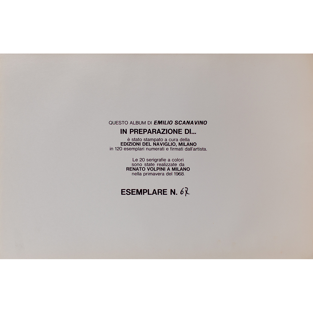 album di 20 serigrafie a colori, ed. 67 su una tiratura complessiva di 120 esemplari realizzate da Renato Volpini e stampate a cura delle Edizioni del Naviglio, Milano. Dimensioni: cm 23,5x35,5. Ciascun foglio è firmato dall’artista.