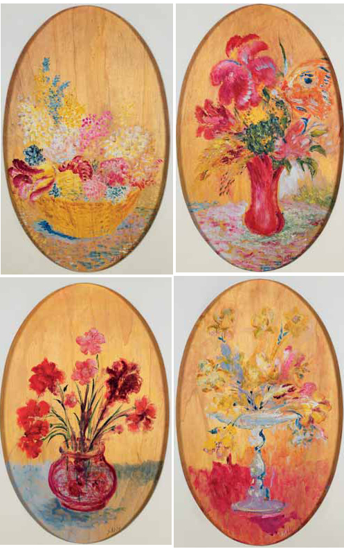 Aligi Sassu Milano 1912 – Pollença 2000 Quattro pannelli raffiguranti Vasi di fiori olio su tavola, cm 85x54,8 ciascuno. Firmati in basso a destra: Sassu. Provenienza: Milano, collezione privata