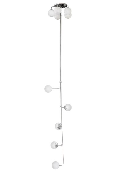 Lampada a sospensione a dieci luci modello "a404 Strozzi". Produzione Candle, Italia, anni '70. Diffusori globulari in vetro sfumato, struttura in metallo cromato. (h cm 435 ca,) (lievi difetti)