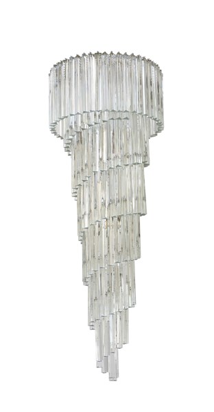 Grande lampadario a pendenti a triedro. Murano, anni '80. Vetro massello e incolore. (h cm 240; d cm 53)