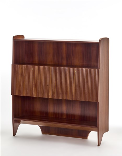 Mobile contenitore con vano centrale attrezzato a doppia anta a ribalta con fornte rivestito da listelli sagomati. Fianchi arrotondati e scanalati, sporgenti nella parte superiore e sagomati nella parte inferiore con terminazione a ricciolo. Esecuzione Fratelli Lietti fu Paolo, Cantù, 1955/1956. Legno di mogano massello, bordato e impiallacciato. (cm 140x150x36) (lievi difetti)