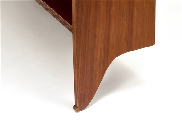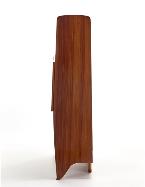 Furniture with central part with double flap doors and ovens covered with shaped strips. Rounded and fluted sides, protruding in the upper part and shaped in the lower part with a curl termination. Execution by Fratelli Lietti fu Paolo, Cantù, 1955/1956. Solid, edged and veneered mahogany wood. (140x150x36 cm.) (slight defects)