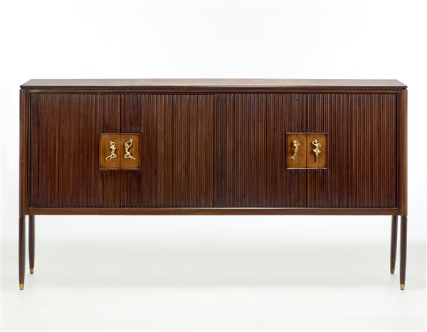 Credenza a quattro ante. Italia, anni '50. Struttura in legno di mogano impiallacciato e massello, maniglie ottone raffiguranti figure femminili danzanti, piedini in ottone. (cm 240x126x44) (difetti)