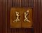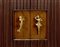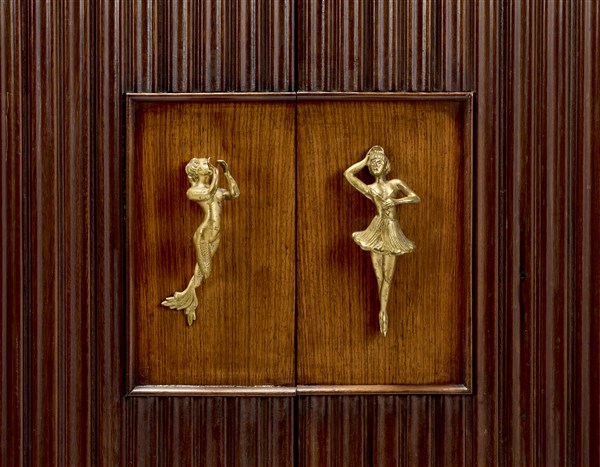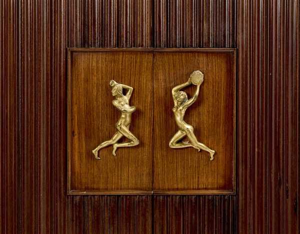 Four doors sideboard. Italy, 1950s. Veneered and solid wood mahogany structure, brass handles depicting dancing female figures, brass feet. (240x126x44 cm.) (defects)