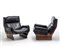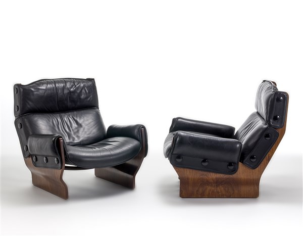 Coppia di poltrone modello "P110 Canada". Produzione Tecno, Varedo, 1965. Multistrato curvato e massello, imbottitura rivestita in pelle nera. Recanti etichetta adesiva del produttore. (cm 80x78x83) (lievi difetti)