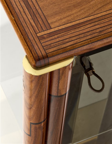 Coppia di vetrine modello "Bacheca". Produzione B&B, Italia, 1977. Legno massello, bordato e multistrato, guarnizioni in ottone, lastre in cristallo fumè molato, ripiani in cristallo molato giallo e blu. (cm 56x142x44) (lievi difetti)