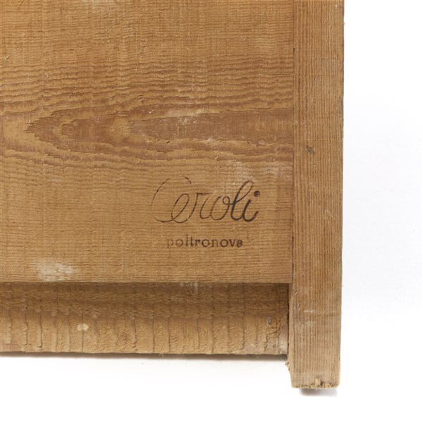 Divano. Produzione Poltronova, Firenze, anni '70. Legno di pino russo grezzo. Marcato a fuoco al retro "Ceroli - Poltronova". (cm 235,5x80x69)