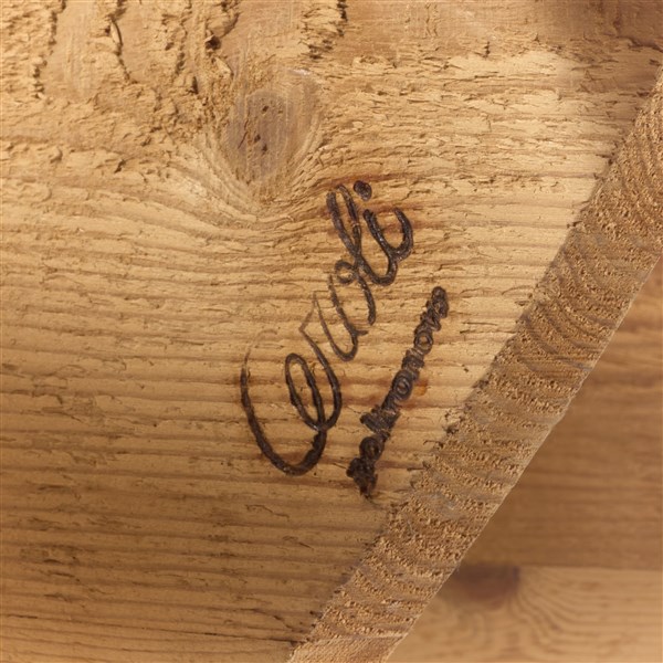 Table. Produced by Poltronova, Florence, 1973. Raw Russian pine wood, glass top. Fire-marked "Ceroli - Poltronova". (h 73 cm.; d 164 cm.)