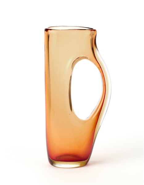 Vaso della serie "Forati" o "Buchi". Esecuzione Venini, Murano, 1951ca. Vetro soffiato composto "Corniola". Corpo a un'ansa e sezione schiacciata. Disegno n. 4514 del catalogo di fornace. Firmato all'acido sotto la base "venini murano ITALIA". (h cm 29)