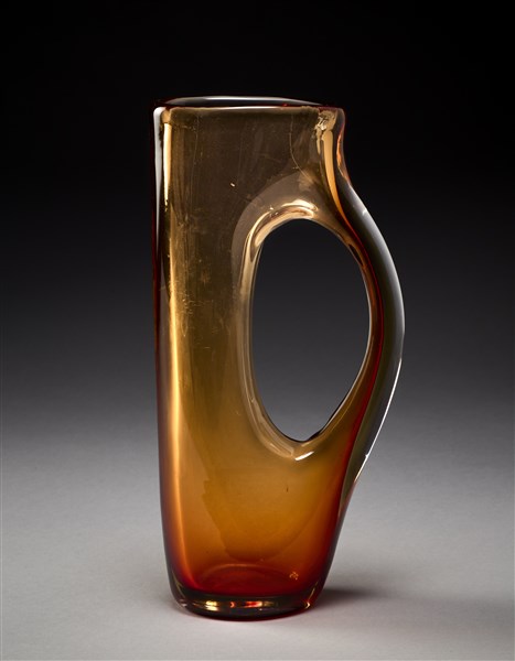 Vase of the series "Forati" o "Buchi". Execution by Venini, Murano, 1951ca. Blown "Corniola" glass. One handle and body with flattened section. Drawing n. 4514 of the furnace catalog. Acid-etched signature under the base "venini murano ITALIA". (h 29 cm.)