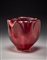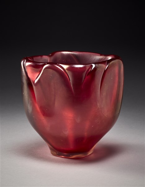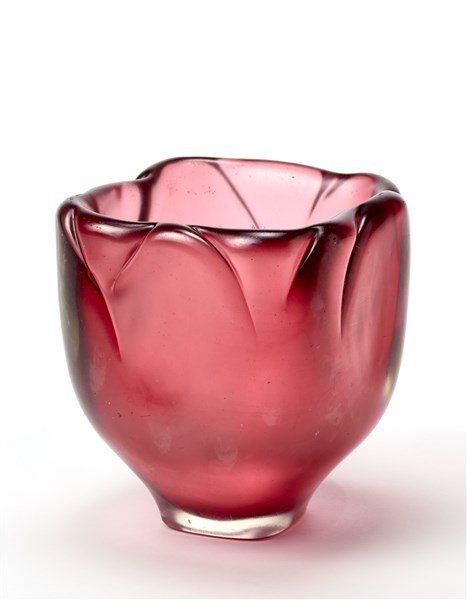 Large cup with organic shape and quadrangular section. Rim with petals. Execution by Seguso Vetri d'Arte, Murano, 1930s/1940s. Crystal and red-purple colour blown glass, strongly iridescent on the external surface. (h 20 cm.; d 18 cm.)