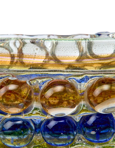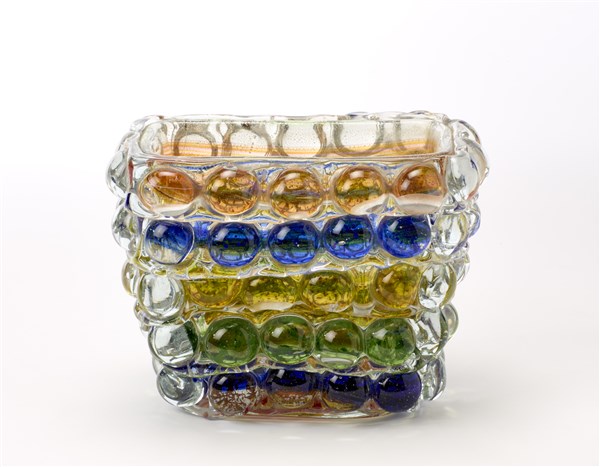Vaso con corpo a sezione quadrangolare rastremata della serie "Lenti". Esecuzione Barovier & Toso, Murano, anni '60. Vetro sommerso policromo. (cm 28x21x7,5)