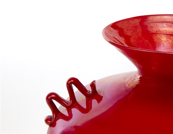 Vaso con corpo bulbiforme e ampio collo svasato modello "Z 305". Murano, 1923ca. Vetro soffiato incamiciato rosso opaco e cristallo, iridato sulla superficie esterna. Morise applicate in pasta vitrea rossa. (h cm 22)
