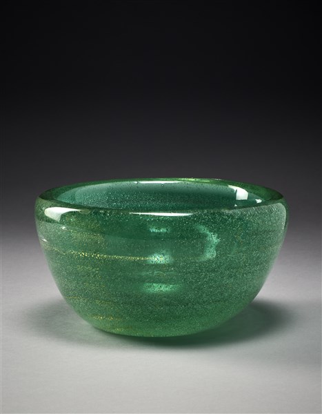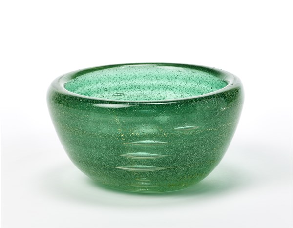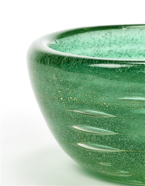 Grande coppa della serie "Sommersi". Esecuzione Venini, Murano, 1934ca. Vetro sommerso verde con costolature interne orizzontali e inclusione di foglia d'oro. Disegno del Catalogo Blu Venini n. 3522. Firmata all’acido sotto la base "venini murano". (h cm 12; d cm 22)
