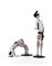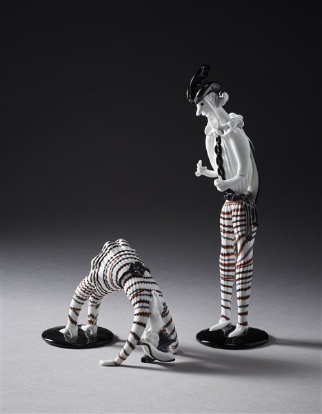 Lotto composto da due figurine raffiguranti rispettivamente Arlecchino ginnasta e Pantalone della serie "Commedia dell'arte". Murano, anni '50/'60. Vetro lattimo, nero rosso e bruno. Compatibili con i disegni di fornace Venini 2906 e 2901. Non recano firme. (h cm 37; h cm 15)(lievi difetti)