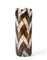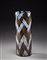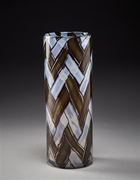 Vaso cilindrico della serie "a spina". Esecuzione Barovier & Toso, Murano, 1958ca. Vetro soffiato a tessere rettangolari in vetro opalescente bordato di ametista e disposte a spina di pesce. (h cm 29)