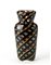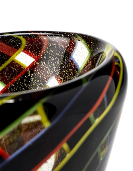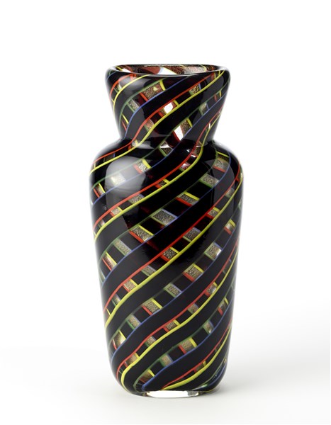Vaso a balaustro a sezione schiacciata modello "7143 a colori incrociati". Esecuzione Seguso Vetri d'Arte, Murano, 1942ca. Vetro soffiato con fasce incrociate in vetro ametista scuro bordate di giallo, rosso, blu e verde, con inclusione di foglia d’oro. (h cm 31)