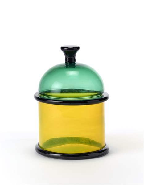 Vaso con coperchio modello "Faliera". Probabile produzione Vistosi, Murano, anni '70. Vetro soffiato nero opaco, giallo e verde trasparente. Esemplare non firmato e non numerato. (h cm 27; d cm 19)