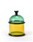 Jar with lid model "Faliera". Probabile produzione Vistosi, Murano, 1970s. Opaque black, yellow and transparent green blown glass. Unsigned and unnumbered specimen. (h 27 cm.; d 19 cm.)