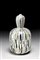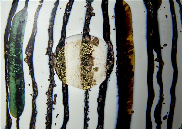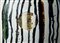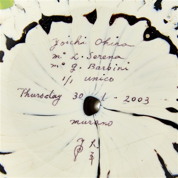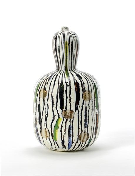 Vaso a forma di zucca con colletto cilindrico. Esecuzione Livio Serena e Giacomo Barbini, Murano, 2003. Vetro soffiato a canne verticali lattimo e nere, con inserti di avventurina, a murrine e a piccole canne trasparenti di vari colori con inclusione di foglia d'oro. Superficie esterna lucidata opaca. Orlo in pasta vitrea rossa. Pezzo unico. Firmato e datato a punta sotto la base "Yoichi Ohira, m° L. Serena, m° G. Barbini, 1/1 unico, Thursday 30-01-2003, Murano", monogramma dell'artista. (h cm 30)
