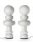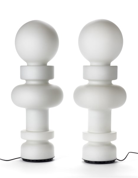 Coppia di lampade modello "Re". Produzione Fontana Arte, Milano, 1968. Vetro bianco satinato, base in metallo laccato nero. (h cm 88) (lievi difetti)