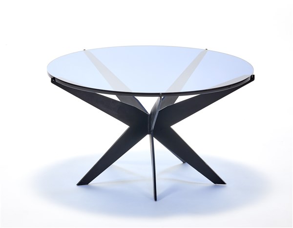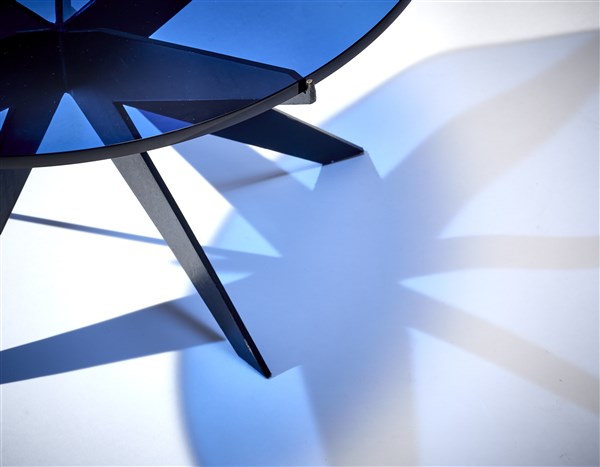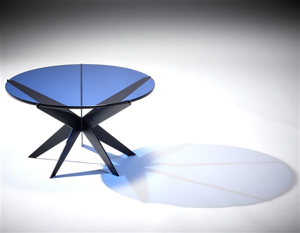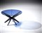 Tavolo da salotto modello "2066". Produzione Fontana Arte, Milano, anni '50/'60. Base in ferro verniciato nero, piano in cristallo molato blu. (h cm 35; d cm 62)