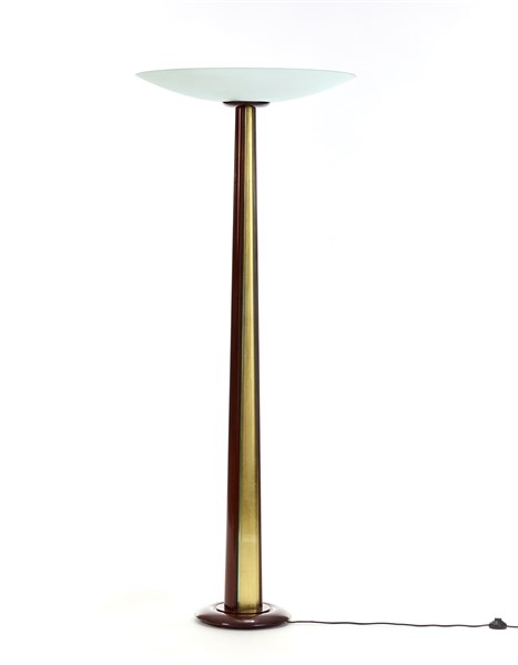 Lampada da terra. Esecuzione Fontana Arte, Milano, anni '30/'40. Fusto in legno di mogano massello accoppiato a due lastre di cristallo molato specchiato di forte spessore con retroapplicazione di foglia d'oro. Grande coppa diffusore in cristallo acidato e molato. (h cm 179) (lievi difetti)