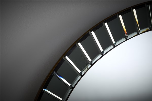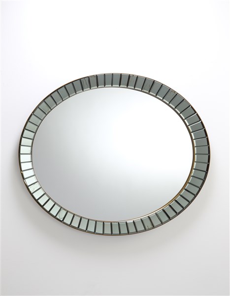 Specchio ellittico modello "1608". Produzione Fontana Arte, Milano, anni '50/'60. Cornice a elementi prismatici di cristallo colorato verdino molato e specchiato, ghiera in ottone, sottostruttura in legno. (cm 96x110) (lievi difetti)